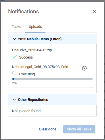 Current Repository (shown above as ‘2025 Nebula Demo (Enron)’): Displays uploads for the current repository only.