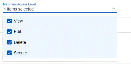 Because external Groups are hidden from normal users (and Firm Admins), permissions must be set for external Firms at the Firm-level. This is accomplished through the “Maximum Access Level” selector that appears when an object is shared. This not only allows Groups within an external Firm to have limited access to an object, it also ensures that users from different Firms are not elevating permissions for that object beyond what that Firm’s manager or administrator have previously dictated.