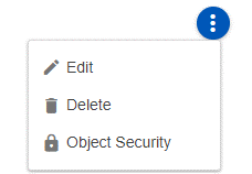 Users can access an object’s security from most listing or detail pages where the object is viewable with a “3dot” menu. From this menu, selecting “Object Security” will launch the settings dialog.