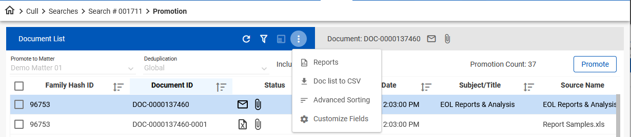 One challenge that practitioners experience when preparing for promotions is the inability to precisely analyze deduplicated data prior to actually promoting it. To solve this, we added a new feature called “promotion view” that allows users to generate a document listing of only the documents that would be promoted, post-deduplication. To access this listing, a user simply clicks the dynamically generated “Promotion Count” link in the promotion bar. From this new listing, any available mass action (Reports, Doc List to CSV) or bulk association (Lists) can be run on the documents slated for promotion. To return to the main listing, click the preceding portion of the breadcrumb trail above the document list panel.