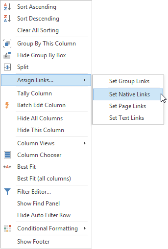 You’ll access this functionality by right-clicking on a column in the document grid. Here, we’ve added the “Assign Links” menu with actions to Set Group Links, Set Native Links, Set Page Links, and Set Text Links.