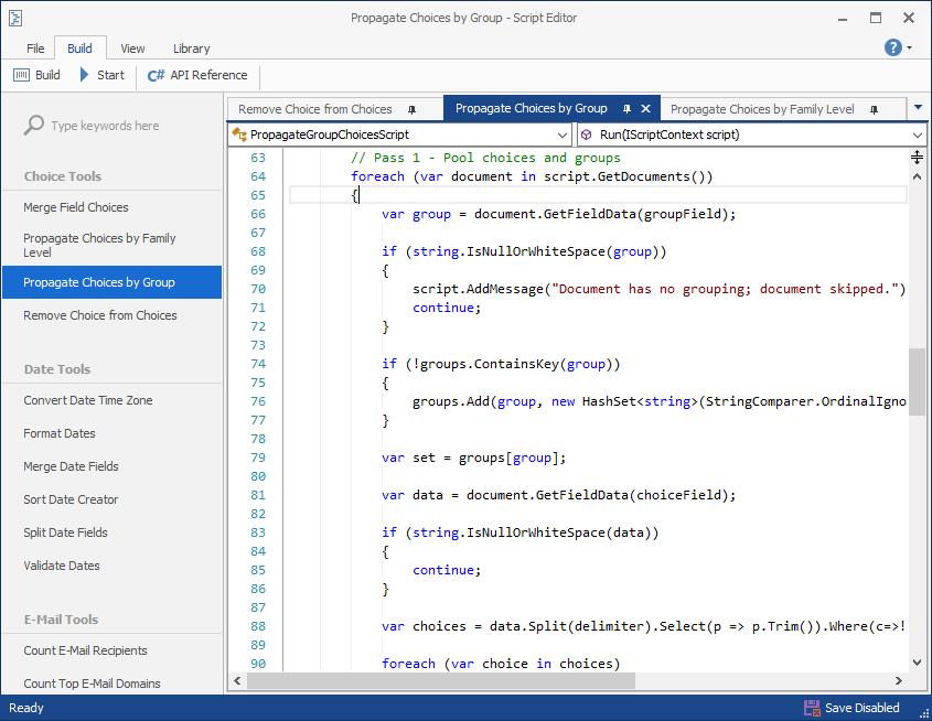 Improvements to the included Script Editor add a new, multi-document (tabbed) interface. Prior versions of ReadySuite limited the opened script selection to a single script. With the tabbed interface, you can view and edit multiple scripts at once.