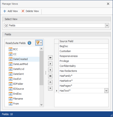 We’ve introduced a new feature for managing column views and field sets in this release. Using the Manage Views dialog, you’ll be able to adjust the fields shown in the ‘Fields Panel’ and existing field sets shown on the Document Grid. Use this view to add or remove existing views – which will persist across ReadySuite sessions.