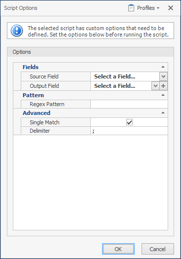 A new script under Other Tools now allows you to run a regular expression against a source field and output the first or all regular expression matches into a destination field.
