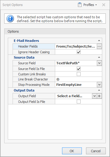 A new script under E-Mail Tools now allows you to remove a selected list of e-mail headers from a text file or text field. For example, utilizing the Remove Email Headers script, you can remove the fields To, From, CC, BCC, Subject, Attach or Attachments from the top of extracted e-mail text files. An option is available to limit the removal of these headers to their first instance or for the whole file.